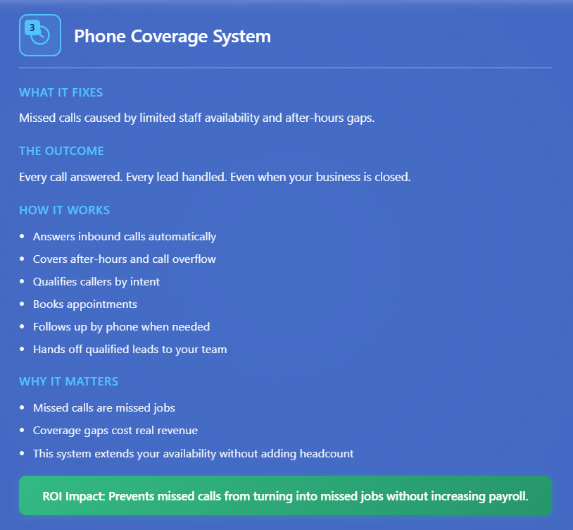 Answers, qualifies, and books calls automatically so no job is lost due to limited staff or after-hours gaps.